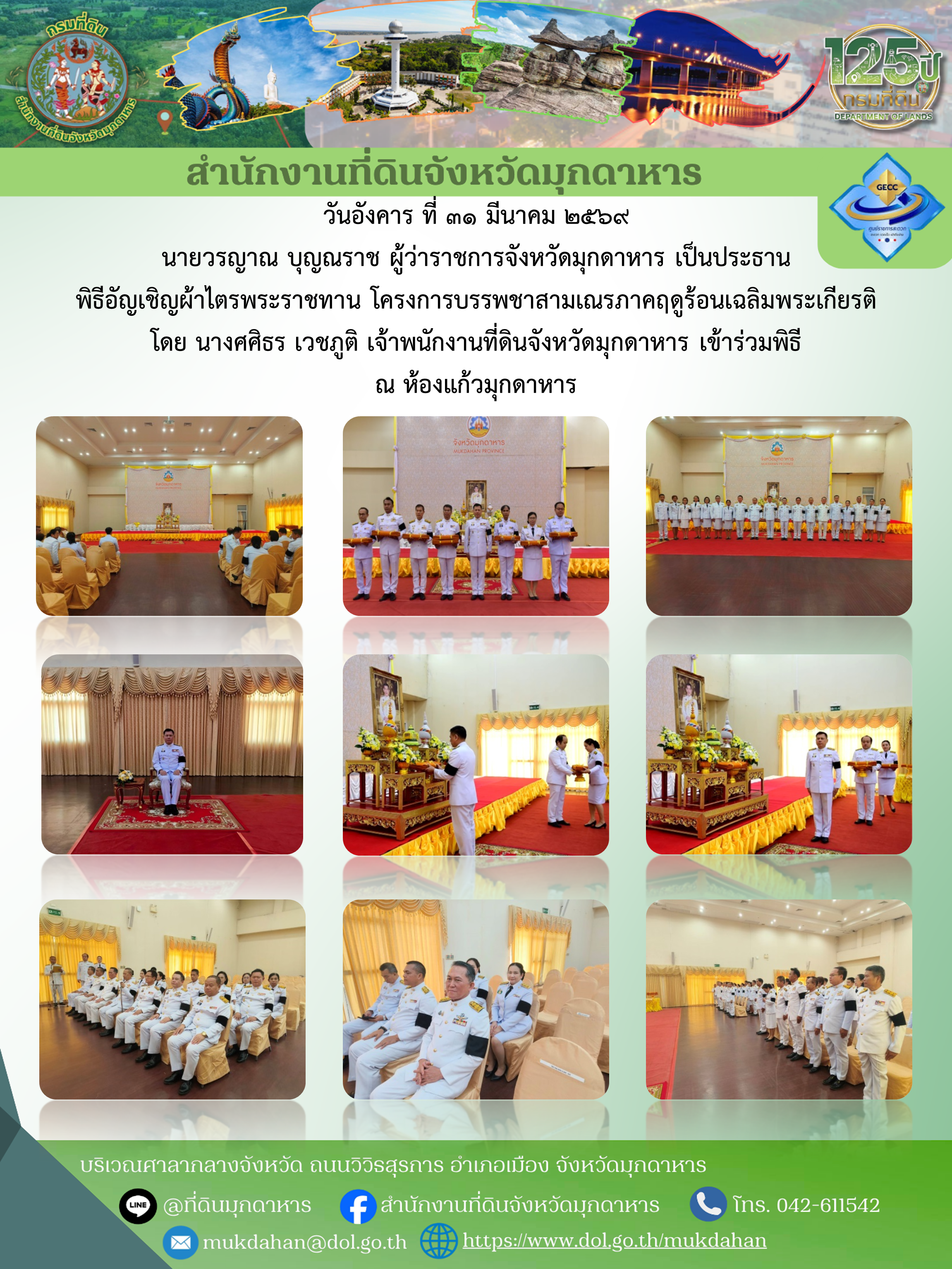 วันที่ 31 มีนาคม 2569 เวลา 10.00 น. จังหวัดมุกดาหารจัดพิธีอัญเชิญผ้าไตรพระราชทาน โครงการบรรพชาสามเณรภาคฤดูร้อนเฉลิมพระเกียรติ ณ ห้องแก้วมุกดา ศาลากลางจังหวัดมุกดาหาร อำเภอเมืองมุกดาหาร จังหวัดมุกดาหาร โดยนายวรญาณ บุญณราช ผู้ว่าราชการจังหวัดมุกดาหาร เป็นประธานในพิธี พร้อมด้วยรองผู้ว่าราชการจังหวัดมุกดาหาร นายอำเภอหรือผู้แทน และผู้เข้าร่วมพิธีจากทุกอำเภอเข้าร่วมอย่างพร้อมเพรียง