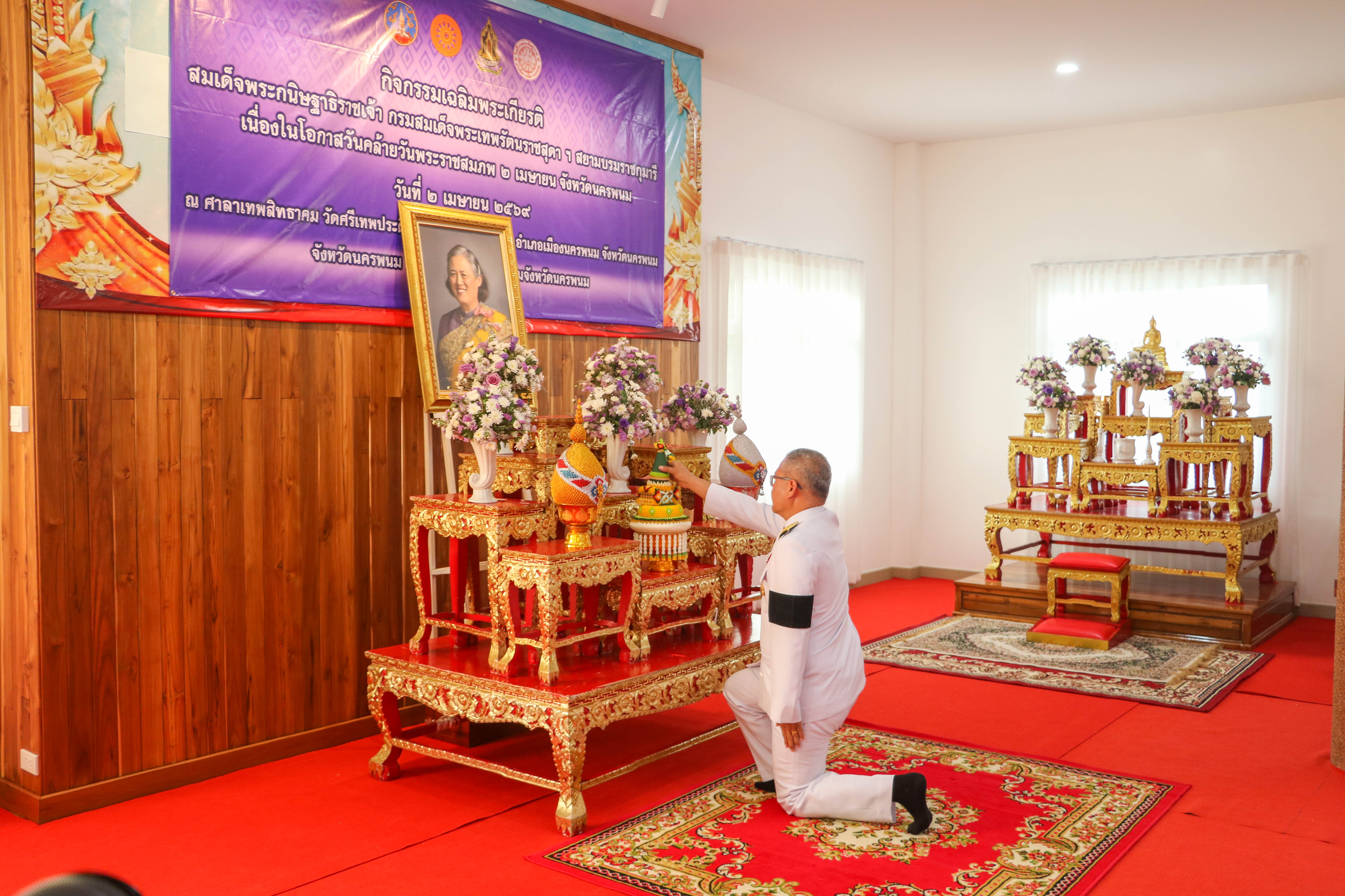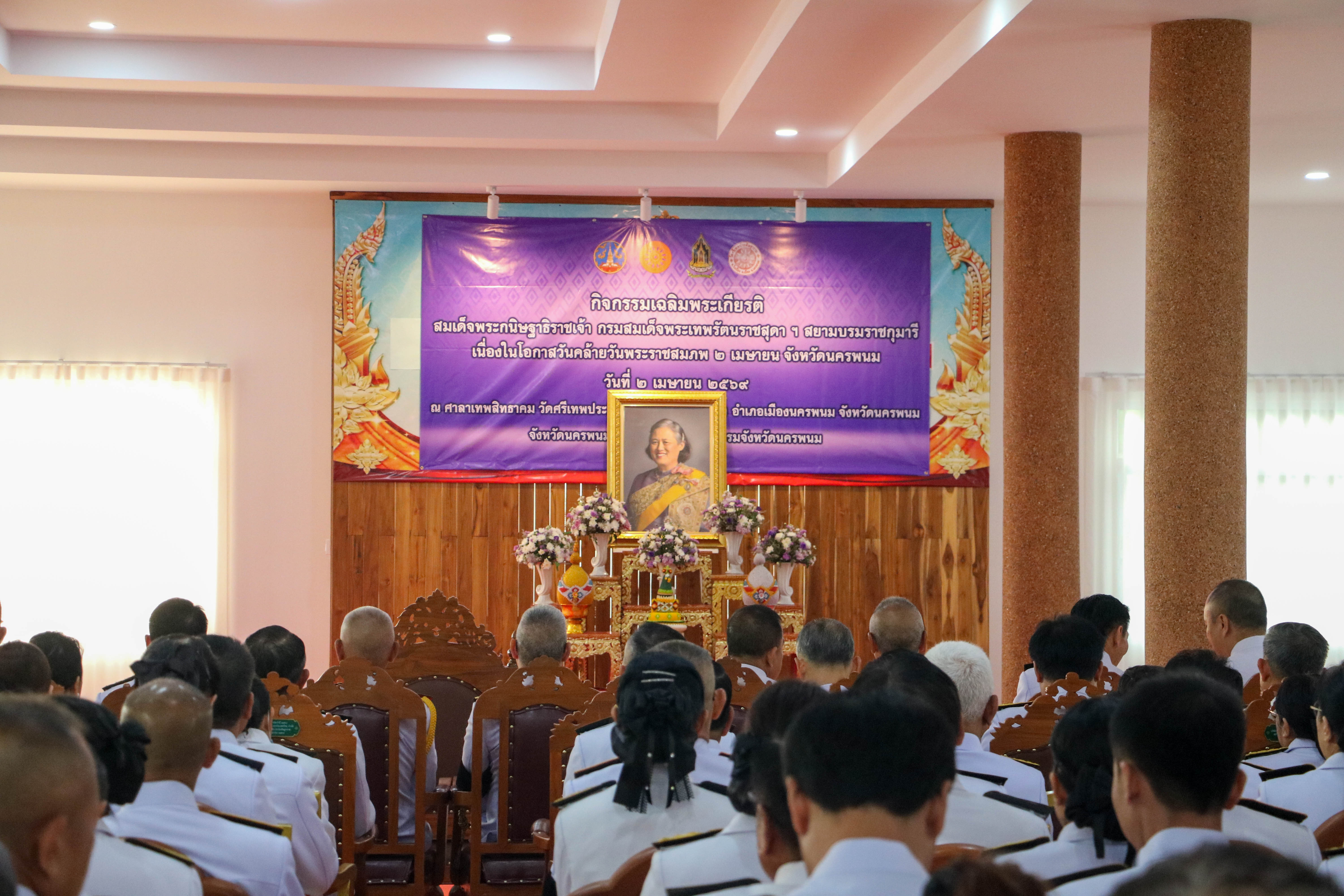วันที่ ๒ เมษายน ๒๕๖๙ เวลา ๐๗.๐๐ น. ว่าที่พันตรี อดิศักดิ์ น้อยสุวรรณ ผู้ว่าราชการจังหวัดนครพนม เป็นประธานพิธีเจริญพระพุทธมนต์และทำบุญตักบาตรถวายเป็นพระราชกุศล เนื่องในวันคล้ายวันพระราชสมภพสมเด็จพระกนิษฐาธิราชเจ้า กรมสมเด็จพระเทพรัตนราชสุดาฯ สยามบรมราชกุมารี โดยมีนายธเนศ ชาตะวราหะ เจ้าพนักงานที่ดินจังหวัดนครพนม พร้อมด้วยเจ้าหน้าที่เข้าร่วมพิธี ณ วัดศรีเทพประดิษฐาราม อ.เมือง จ.นครพนม