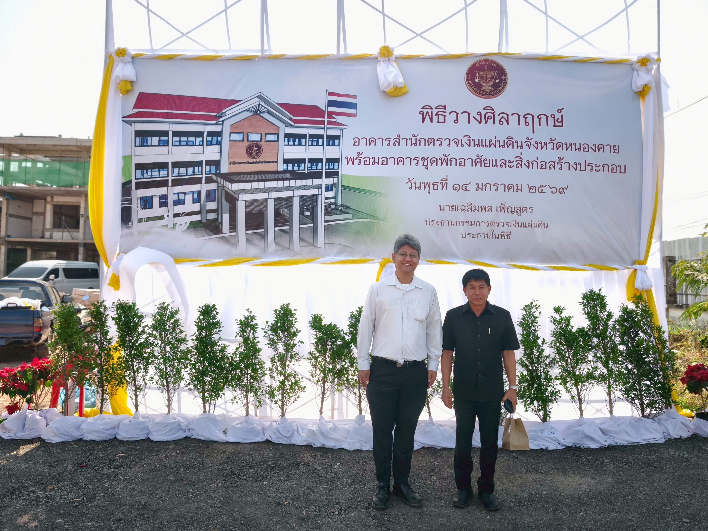 วันพุธที่ ๑๔ มกราคม ๒๕๖๙ เวลา ๐๘.๐๐ น. นายพิชญ์ ติรณสวัสดิ์ เจ้าพนักงานที่ดินจังหวัดหนองคาย เข้าร่วมพิธีวางศิลาฤกษ์ อาคารสำนักงานตรวจเงินแผ่นดินจังหวัดหนองคาย พร้อมอาคารชุดพักอาศัยและสิ่งก่อสร้างประกอบ โดยมีนายเฉลิมพล เพ็ญสูตร ประธานกรรมการตรวจเงินแผ่นดินเป็นประธานในพิธี ณ สถานที่ก่อสร้างสำนักงานตรวจเงินแผ่นดินจังหวัดหนองคาย อำเภอเมืองหนองคาย จังหวัดหนองคาย